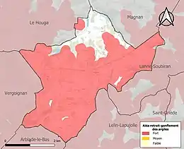 Le retrait-gonflement des sols argileux est susceptible d'engendrer des dommages importants aux bâtiments en cas d’alternance de périodes de sécheresse et de pluie. 84,1 % de la superficie communale est en aléa moyen ou fort (94,5 % au niveau départemental et 48,5 % au niveau national). Sur les 86 bâtiments dénombrés sur la commune en 2019, 78 sont en aléa moyen ou fort, soit 91 %, à comparer aux 93 % au niveau départemental et 54 % au niveau national. Une cartographie de l'exposition du territoire national au retrait gonflement des sols argileux est disponible sur le site du BRGM[20],[Carte 3].
