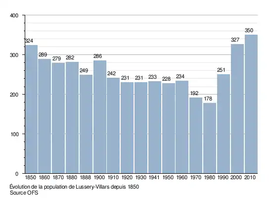 La population de Lussery-Villars est de 324 personnes en 1850. Le nombre d'habitants descend à 249 en 1888, remonte à 286 en 1900, puis redescend à 242 en 1910. Après une période stable jusqu'en 1960, il descend à 178 en 1980 avant de doubler en 30 ans pour atteindre 350 en 2010. Le graphique suivant résume l'évolution de la population de Lussery-Villars entre 1850 et 2010[7] :
