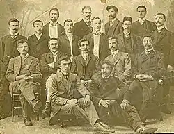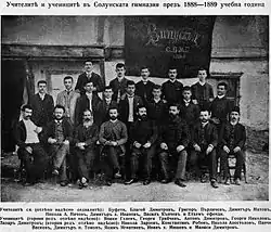 Elèves, deuxième rang: Nikola Zarzev, Konstantin Robev (bg), Nikola Apostolov (bg), Pantcho Vaskov (bg), Dimităr Poptomov (bg), Yakim Ignatiev (bg), Ivan Hadjimichev, Manassi Dimitrov (bg)