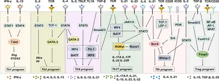 Les lymphocytes Th2, définies par l'expression du facteur de transcription GATA-3 et des cytokines interleukine 4, interleukine 5 et de l'interleukine 13, protègent l'hôte contre les infections par les helminthes, facilitent la réparation des tissus et contribuent aux inflammations chroniques telles que l'asthme et les allergies[15]. L'interleukine 4 sécrétée par les cellules dendritiques et le groupe de cellules lymphoïdes innées de type 2 se lie au récepteur de l'interleukine 4 sur les cellules T CD4+, conduisant à l'expression de GATA-3 via la phosphorylation de STAT6 et la production ultérieure de cytokines liées à Th2 [16]. La production autocrine de l'interleukine 4 par les cellules T CD4+ activées favorise en outre la différenciation en lymphocyte Th2 [17]. De plus, GATA-3 intervient dans la répression du développement des cellules Th1 en éliminant les gènes liés à Th1 tels que TBX21, IFNG, STAT4 et IL12RB2 [18]. D'autres facteurs de transcription tels que NFAT1, C-MAF, IRF4 et JUNB peuvent promouvoir le programme Th2 en induisant la production d'interleukine 4 [18]. 87 De plus, le facteur de transcription TCF-1, activé par la stimulation du récepteur des lymphocytes T , initie la différenciation des cellules Th2 en favorisant l'expression de GATA-3 [19].