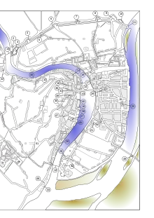 Plan ancien du Vieux Lyon, au bord de la Saône (située dans la partie basse), détaillant l'architecture des bâtiments. Une cathédrale est située au centre du plan.