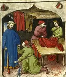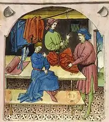 Miniature dans le Garbeau de l'Épicerie, manuscrit de 1519, représentant le consulat en assemblée octroyant la charge de receveur des taxes sur les épices à l'apothicaire Guillaume Gautheret. Archives municipales de Lyon (CC 4292).