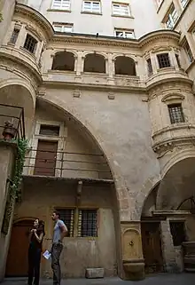 L'hôtel de Roanne[N 9] étant le siège de la sénéchaussée depuis 1435, les rues alentour sont peuplées d'hommes du roi, d'officiers. Durant les guerres d'Italie, ce quartier accueille le roi et sa cour[aq 2]. Le long de la rue du Palais, la population est composée au début de la Renaissance d'une solide moyenne bourgeoisie, avec des merciers, pelletiers, apothicaires, notaires, changeurs et docteurs en lois. Cette zone, avec la montée en puissance du pouvoir royal sur la ville représenté par l'hôtel de Roanne, repousse les habitants les plus pauvres vers le sud, autour de Saint-Jean et Saint-Georges[an 1]. En 1538, le consulat, avec l'accord de François Ier, démolit le clos du palais de Roanne pour établir une place, qui hérite du même nom[z 1].