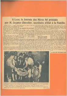 Lyon est choisi par Vichy pour être le lieu de la première « Journée des mères » le , soutenue et portée très officiellement par le régime. Cette fête existe à Lyon depuis les années 1920, sans avoir jusque-là rencontré un écho notable dans la population. Vichy décide d'en faire un évènement bien plus considérable, destiné à promouvoir à la fois sa politique nataliste, mais également un idéal social des mères comme garantes de la civilisation française chrétienne. La cérémonie est présidée par le secrétaire d'État à la santé et à la famille Jacques Chevalier. la place de la religion est importante, avec un « Pèlerinage des mères » à Fourvière et un discours retransmis à la radio du cardinal Gerlier[o 2].