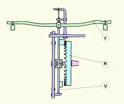 - l' oscillateur (appelé régulateur dans l'image ci-dessus) : ensemble transformant le mouvement « non uniforme » donné par le moteur en un mouvement dit « régulier » du système. Il comprend :