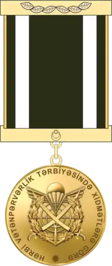 La médaille de la République d’Azerbaïdjan pour les services dans l’éducation patriotique militaire est décernée aux militaires, fonctionnaires et autres personnes de l’autorité exécutive compétente pour leurs services dans l’organisation de la mobilisation et de la conscription, de l’éducation patriotique militaire et de la propagande patriotique[1].
