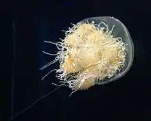 Très souvent fuie à cause de ses cellules urticantes qui constituent son principal moyen de défense en l'absence de squelette[65], la méduse a néanmoins des prédateurs (124 espèces de poissons et 34 espèces d'autres animaux — anémones de mer, thons, requins, dauphins, espadons, tortues de mer, manchots, pingouins — recensés), et il semble que leur nombre ait été sous-estimé, comme l'a été l'importance des méduses dans le réseau trophique marin[66],[67],[68]. Cette sous-estimation s'explique par le fait qu'il est difficile de savoir quels animaux consomment des méduses car une fois ingérées, elles deviennent vite non-identifiables dans le tractus digestif du prédateur[62].
