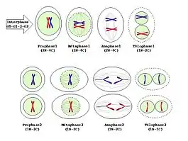 Ainsi, durant la méiose, la quantité d'ADN au sein de la cellule évolue. Chaque cellule divise son patrimoine génétique (contenu dans des chromosomes) en deux afin de n'en transmettre que la moitié aux cellules filles. Elle se déroule en plusieurs étapes formant un ensemble de deux divisions cellulaires, successives et inséparables. La première division méiotique est dite réductionnelle car elle permet de passer de 2n à n chromosomes doubles. La seconde est dite équationnelle car elle conserve le nombre de chromosomes, de n chromosomes doubles à n chromosomes simples. La méiose permet ainsi la formation de quatre cellules filles haploïdes (ou gamètes).