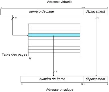 - Un mécanisme de traduction (translation, ou génération d'adresse) assure la conversion des adresses virtuelles en adresses physiques, en consultant une table des pages (page table en anglais) pour connaître le numéro du cadre qui contient la page recherchée. L'adresse physique obtenue est le couple (numéro de cadre, déplacement).