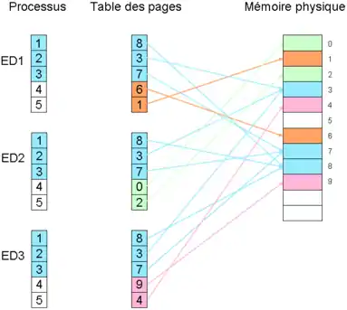Le schéma suivant montre trois processus en cours d'exécution, par exemple un éditeur de texte nommé Ed. Les trois instances sont toutes situées aux mêmes adresses virtuelles (1, 2, 3, 4, 5). Ce programme utilise deux zones mémoire distinctes : les pages qui contiennent le code, c’est-à-dire les instructions décrivant le programme, et la zone de données, le fichier en cours d'édition. Il suffit de garder les mêmes entrées dans la table des pages pour que les trois instances se partagent la zone de code. Par contre, les entrées correspondantes aux pages de données sont, elles, distinctes.