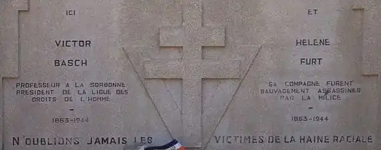 - « Ici, Victor Basch, professeur à La Sorbonne et président de la ligue des droits de l'Homme (1863-1944) et Hélène Fürt (1863[Note 1]-1944), sa compagne[Note 2], furent sauvagement assassinés par la milice. N'oublions jamais les victimes de la haine raciale. »