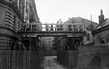 - Aleja Piotra Drzewieckiego, près de la Plac Żelaznej Bramy – à partir de cet endroit vers l’ouest jusqu’à la rue Zachodnia passait le couloir (exclu du ghetto), avec des halles marchandes Mirowski, la caserne Mirowski, l’église de St-Charles-Boromée et la rue Chłodna, qui divisait le ghetto en deux parties[9]. Les plaques commémoratives sur le mur sud des halles « Hale Mirowskie » marquent la limite nord du petit ghetto qui est passée le long des bâtiments.