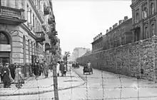 - La rue Żelazna, à l'angle de l'avenue Solidarnośc – les plaques sur le bâtiment d'avant-guerre, où se trouvaient les écoles numéro 10, 17, 56 et 119 à 88[12] rue Żelazna (l’Office du quartier Wola à 90 l'avenue Solidarności d’aujourd’hui) commémorent une des plus importantes portes du ghetto (à l'intersection des rues Żelazna et Leszno) et le bâtiment de la société Collegium (84 rue Leszno) où le Département du Travail et de la Statistique du Conseil juif avait son siège[9]. Le bâtiment constituait une enclave du ghetto dans la zone aryenne. En , il a été liée avec le ghetto par la passerelle en bois à la hauteur du premier étage, au-dessus de la rue Żelazna.