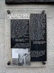 « Suite à la décision des autorités allemandes, le ghetto a été coupé du reste de la ville le . Le terrain, entouré de mur, comptait au début 307 ha, ensuite il a été réduit successivement, à partir du janvier 1942 il a été divisé en deux parties appelées le grand et le petit ghetto. À peu près 360 000 Juifs de Varsovie et 90 000 arrivés d’autres villes y ont été entassés. Environ 100 000 d’eux sont morts de faim. En été 1942, les Allemands ont déporté et assassiné dans les chambres à gaz à Treblinka près de 300 000 personnes. Le le soulèvement du ghetto a éclaté, jusqu’à mi-mai les insurgés et la population civile périssent dans le combat ou dans les bâtiments du ghetto incendiés régulièrement. Le reste de la population a été assassiné en 1943 dans les camps de concentration de Majdanek, Poniatowa et Trawniki. Peu de personnes ont survécu.