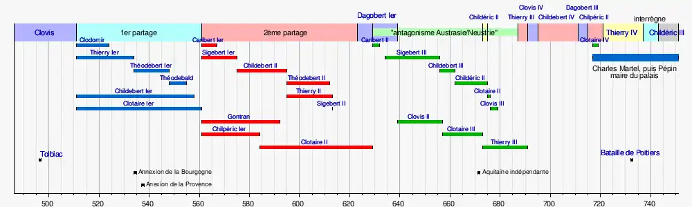 | Clotaire III roi de Neustrie (657-673) | Childéric II roi d’Austrasie (662-673) roi des Francs (673-675) | Thierry III roi de Neustrie (673,675-679) roi des Francs (679-691) | Childebert III roi d’Austrasie (656-662) | Dagobert II roi d’Austrasie (676-679) | |||||||||||||||||||||||||||||||||||||||||||