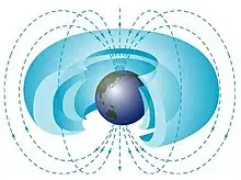 L’image de droite représente les ceintures de rayonnement, une zone toroïdale qui se peuple de protons et d’électrons de haute énergie lors d’orages magnétiques. Ces particules peuvent y résider pendant des semaines voire des mois et constituent une menace importante pour les satellites qui traversent ces régions. C’est notamment le cas des satellites NAVSTAR du système GPS et des satellites Galileo.