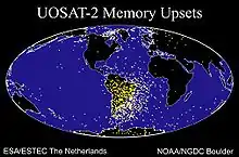Dans l’image de droite, chaque point représente une erreur informatique recensée à bord du satellite anglais UoSat-2 en fonction de son emplacement. Le taux de pannes augmente fortement au-dessus du Brésil, dans une région appelée anomalie Sud Atlantique. Cette région particulière doit son existence à un léger décentrage entre le dipôle magnétique terrestre et l’axe de rotation terrestre. Les ceintures de rayonnement sont relativement plus proches de la Terre au-dessus du Brésil, où davantage de particules énergétiques pénètrent dans la haute atmosphère. Ces particules sont responsables des pannes informatiques observées à bord d’UoSat-2. Un nombre accru d’incidents y est aussi observé pour les ordinateurs de bord des avions de ligne.