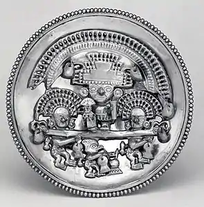- un groupe de grands tumis cérémoniels sommés d'un personnage portant une coiffure en forme de croissant,