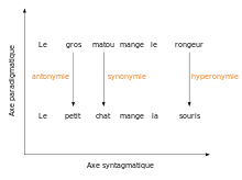- L'hyperonymie repose sur un mot qui renvoie à une catégorie qui englobe l'autre, par exemple : « jaune » pour « couleur d'or ».
