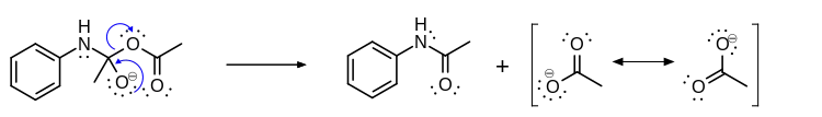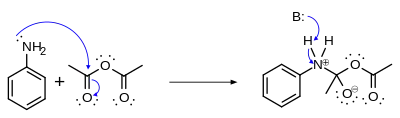 L'aniline s'additionne ainsi, l'anhydride formant un intermédiaire tétraédrique qui va être déprotoné, aidé en cela par la présence de base (l'acétate de sodium). Le second groupe acétate de l'anhydride sert enfin de groupe partant, formant l'amide final :