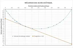 Le volume molaire d'un mélange eau-acide acétique est déterminé expérimentalement à pression et température (20 °C) constantes en fonction de la composition en acide acétique[4]. Les volumes molaires respectifs des corps purs valent :
