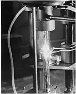 (Image de droite) zone fondue vertical, en 1961. la bobine de chauffage par induction est traversée par un courant alternatif à haute fréquences, elle fait fondre une section de la barre de métal dans le tube. La bobine se déplace lentement vers le bas du tube, déplaçant la zone fondue vers l'extrémité de la barre.