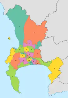 - la Municipalité du sud de la péninsule (South Peninsula Municipality) : Hout Bay, Llandudno, Bergvliet, Wynberg, Constantia, Fish Hoek, Kommetjie, Noordhoek, Simonstown, Muizenberg et les townships d'Ocean View, de Grassy Park ou de Masiphumelele.
