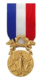- Ruban : C'est un ruban tricolore bleu, blanc et rouge de 30 mm dont les bandes sont verticales et égales de 10 mm, avec une rosette tricolore de 20 mm sur la médaille d’or.