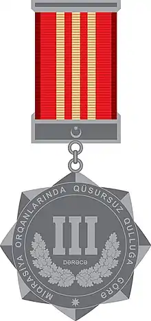 La médaille de la république d'Azerbaïdjan «Pour un service impeccable dans les organismes de migration» est décernée aux employés ayant un rang spécial de service dans les organismes de migration de la république d'Azerbaïdjan qui ont accompli 10, 15 et 20 années civiles au 19 mars de chaque année pour une qualité irréprochable l'exercice de fonctions officielles. La médaille de la république d'Azerbaïdjan du 3e degré «Pour un service impeccable dans les organismes de migration» est décernée aux personnes qui ont servi dans des organismes de migration pendant au moins 10 ans[2].