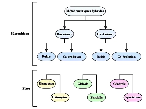 La classification hierarchique se fonde sur le niveau (bas ou haut) de l’hybridation et sur son application (en relais ou concurrente). Dans une hybridation de bas niveau, une fonction donnée d’une métaheuristique (par exemple, la mutation dans un algorithme évolutionnaire) est remplacée par une autre métaheuristique (par exemple une recherche avec tabou). Dans le cas du haut niveau, le fonctionnement interne « normal » des métaheuristiques n’est pas modifié. Dans une hybridation en relais, les métaheuristiques sont lancées les unes après les autres, chacune prenant en entrée la sortie produite par la précédente. Dans la concurrence (ou coévolution), chaque algorithme utilise une série d’agents coopérants ensembles.