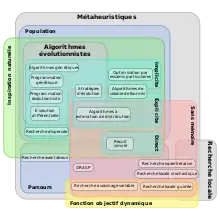 Il existe un grand nombre de métaheuristiques différentes, allant de la simple recherche locale à des algorithmes complexes de recherche globale. Ces méthodes utilisent cependant un haut niveau d’abstraction, leur permettant d’être adaptées à une large gamme de problèmes différents.