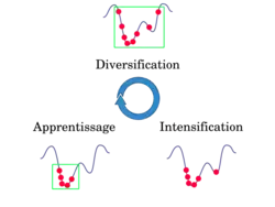 La diversification (ou exploration, synonyme utilisé presque indifféremment dans la littérature des algorithmes évolutionnaires) désigne les processus visant à récolter de l'information sur le problème optimisé. L'intensification (ou exploitation) vise à utiliser l'information déjà récoltée pour définir et parcourir les zones intéressantes de l'espace de recherche. La mémoire est le support de l'apprentissage, qui permet à l'algorithme de ne tenir compte que des zones où l'optimum global est susceptible de se trouver, évitant ainsi les optima locaux.