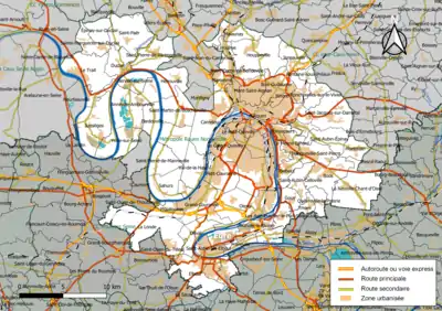 Située dans le sud du département de la Seine-Maritime, l'intercommunalité Métropole Rouen Normandie regroupe 71 communes et s'étend sur 663,8 km2[4]. Ce territoire peut être schématiquement réparti en trois tiers comparables, entre les espaces boisés, les zones rurales et le centre urbanisé[5].