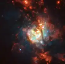 Mais, ce n'est pas le seul processus en jeu au centre de cette galaxie. Le trou noir supermassif ingurgite de vastes quantités de matière, trop même, et en même temps il éjecte de grande quantité de matière et d'énergie vers l'extérieur rendant la région de sursaut d'étoiles encore plus désordonnée[14].