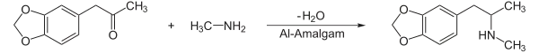 À partir du pipéronal, une autre synthèse consiste à passer par la MDA obtenue par réduction complète (LiAlH4) du nitrostyrène issu de la réaction de Henry avec le nitroéthane[30]. La MDA est ensuite convertie en carbamate ou en formamide dont la réduction par LiAlH4 donne la MDMA[20].
