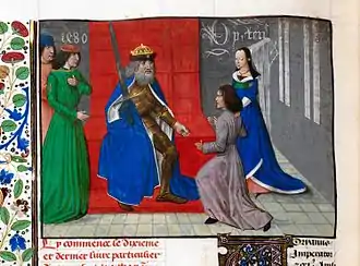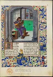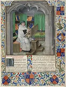 - Le frontispice du Miroir historial, traduction française, par Jean de Vignay, du Speculum historiale de Vincent de Beauvais[7],[19].