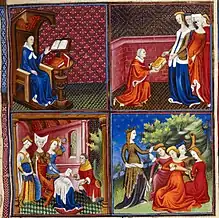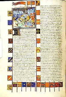 - Manuel d'histoire de Philippe de Valois, 1416, frontispice seulement, BNF Fr. 14285[11]