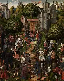 | Note : Marie tend à Jésus enfant une rose, signe de l'amour divin. Muret, gazon et fleurs (violettes) font allusion au thème marial du jardin fermé, symbole de la pureté sacrée de la Vierge, Marie mère de Dieu. Bonne copie ancienne plutôt qu'original, d'une composition archaïsante marquée par le Maître de Flémalle[13]. | ||||