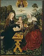 | Note : des nombreuses variantes[11] sur le thème de la sainte Anne trinitaire[12], cette version est le panneau central d'un triptyque de sainte Anne conservé dans le Suermondt-Ludwig-Museum à Aix-la-Chapelle. Les panneaux latéraux sont du Maître de Delft. Dans l'esprit de la fin de la tradition médiévale, le bord avant du jardin est couvert d'un tapis de fleurs et de plantes. Au-dessus de la scène familiale s'élève dans le ciel, et dans un contexte de trinitaire dans le ciel, une scène avec le Fils de Dieu dans une auréole, la colombe du Saint-Esprit et Dieu le Père | ||||