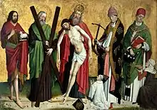 Conservé à la Alte Pinakothek, Munich[1] (salle III, Inventaire n° WAF 625 ), ce grand panneau 101,3 × 133 cm est le panneau central d'un retable, avec portraits des donateurs identifiés comme étant Johann et Margarete Rinck[7]. Deux autres panneaux, représentant respectivement saint Jacques et saint Antoine l'Ermite, constituent des fragments du retable. Ils sont étroits (32 cm) et n'ont donc pas servi de volets de fermeture[8]