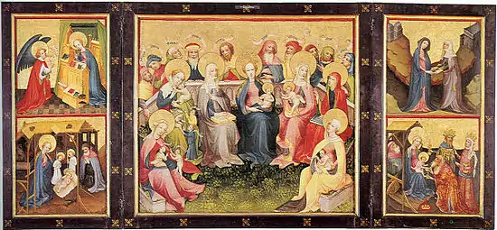 Quand le retable est ouvert, les volets externes représentent des scènes de la vie de Marie : l'Annonciation, la Visitation, la Nativité et l'Adoration des mages. Le panneau central montre, en suivant La Légende dorée, la figure centrale de Marie déjà couronnée, avec l'Enfant, entouré de sa mère Anne portant un livre, et d'Élisabeth, mère de Jean le Baptiste, accompagné de celui-ci enfant. Les deux enfants communiquent déjà. Les autres personnages féminins entourent le groupe central. Séparés d'elles par un muret bornant le jardin, les époux et pères sont représentés debout, chacun identifié par un phylactère. Ils participent eux aussi aux échanges plutôt joyeux de ce groupe. Le charme de ce tableau réside dans l'humanisation des personnages de la hiérarchie céleste, les gestes naturels des enfants, pleins de douceurs des mères, les bavardages aimables des pères. Également par les mouvements des vêtements et l'animation des phylactères, l'artiste souligne la bonne humeur qui domine dans cette réunion de famille[3].