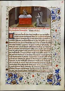 - Consolation de la philosophie de Boèce traduite par Jean de Meung, copiée par David Aubert pour Marguerite d'York, 1 miniature de dédicace, 1476, bibliothèque de l'Université d'Iéna, El fol 85 (attribué par Hanno Wijsman[4])[5]
