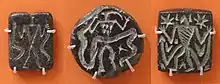 Sceau-timbre en terre cuite avec motif du Maître des animaux, Tell Telloh, ancien Girsu, Fin de la période d'Obeïd, vers 4000 av. J.-C.[16],[17].