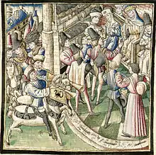 - ce manuscrit, recueil de trois textes sur Troie, fut la propriété et la commande de Jean V de Créquy. Il ne comporte que deux miniatures en grisaille colorée, dont la seconde relate la rencontre de Troïlus et Brisaida, dans le récit de Boccace[3].