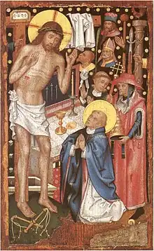 Cette œuvre est datée de 1443[1], ou plus tardivement, vers 1455[8]. Les quatre Pères de l'Église représentés sont à gauche, Grégoire et Jérôme, et à droite Ambroise puis Augustin. Au centre saint Nicolas, à qui était dédié l'autel. Les personnages se détachent sur fond doré, et un soin particulier a été apporté au rendu des luxueux vêtements liturgiques. L'ensemble est richement coloré. Ce tableau est grand (107 × 165 cm), trop grand pour être une prédelle, le tableau a pu servir comme antependium, mais c'était plutôt le panneau central d'un retable dédié à saint Nicolas[8], car d'après Jászai, le monastère de Marienthal-Niesing avait ces saints pour patrons. - Messe de saint Grégoire[9]. Ce tableau date d'environ 1455. De petite taille (48,5 × 29,5 cm), peint sur bois, il représente le pape Grégoire le Grand (540-604) en train de célébrer la messe en l'église Sainte-Croix-de-Jérusalem de Rome, avec en face de lui sur l'autel la vision du Christ en tant qu'Homme de douleur. Il est également au musée LWL d'art et de culture (de) de Münster.