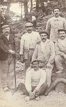 - Ceux qui servent les poseurs, au nombre de deux ou trois pour chacun, les aident à porter, lever, rouler les pierres dans leur place.