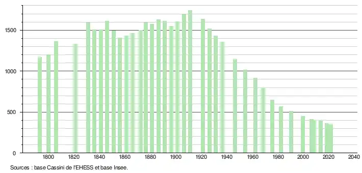 L'évolution du nombre d'habitants est connue à travers les recensements de la population effectués dans la commune depuis 1793. Pour les communes de moins de 10 000 habitants, une enquête de recensement portant sur toute la population est réalisée tous les cinq ans, les populations légales des années intermédiaires étant quant à elles estimées par interpolation ou extrapolation[20]. Pour la commune, le premier recensement exhaustif entrant dans le cadre du nouveau dispositif a été réalisé en 2008[21].
