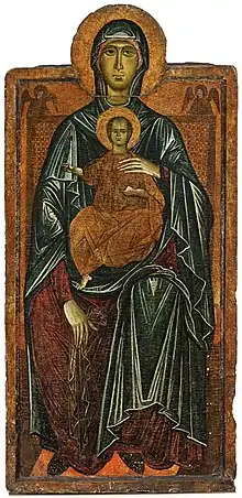 - La Vierge et Enfant en majesté, 60 × 90 cm, avec saillie de l'aura de la Vierge en haut du panneau. Conservée au musée de la Galerie des Offices de Florence, elle se situe, depuis 2007, dans la même pièce d'exposition des trois Maestà (de Duccio, Cimabue et Giotto).