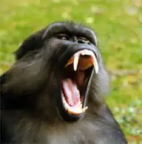 Le mâle dominant pousse un cri spécial. Dans la même espèce, la mimique avec découvrement des dents est une mimique qui annonce les intentions pacifiques de celui qui l'émet, c'est l'équivalent d'un sourire.