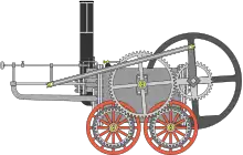 L'ingénieur des mines Richard Trevithick met au point, entre 1797 et 1799, une machine à vapeur haute pression en supprimant le condenseur, avec échappement dans l'atmosphère, ce qui augmente la puissance mais aussi le risque d'explosion. Ces machines deviennent plus compactes et plus simples. Portatives, elles peuvent être installées sur des bateaux, dans des fermes pour battre le blé, dans des moulins ou de petites fabriques[5]. Trevithick oriente rapidement ses machines routières (des locomotives sur route) vers le rail, compte tenu de leur poids et de l'état des routes. Il construit la première locomotive à vapeur sur rails en 1803, la faisant rouler en 1804. Elle peut « remorquer un train de wagons chargé de 10 tonnes de fer et de 70 hommes, parcourant 14 km en quatre heures et cinq minutes[6]. »